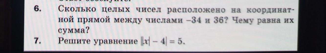 6. Сколько целых чисел расположено на координат- ной прямой между числами -34 и 36? Чему равна их сумма?