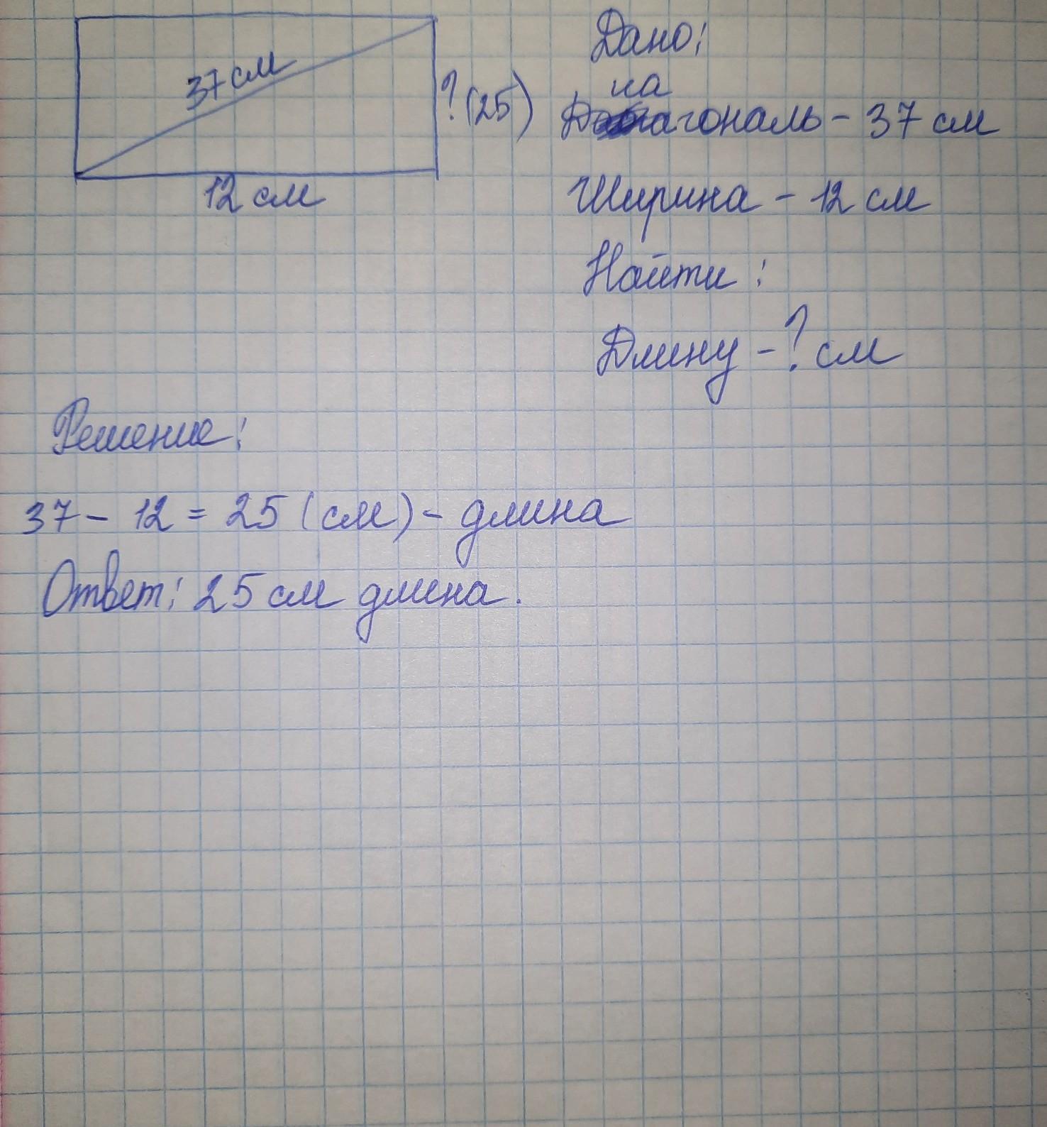 Найдите длину прямоугольника, если его ширина 12 см диагональ 37 см