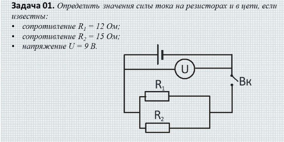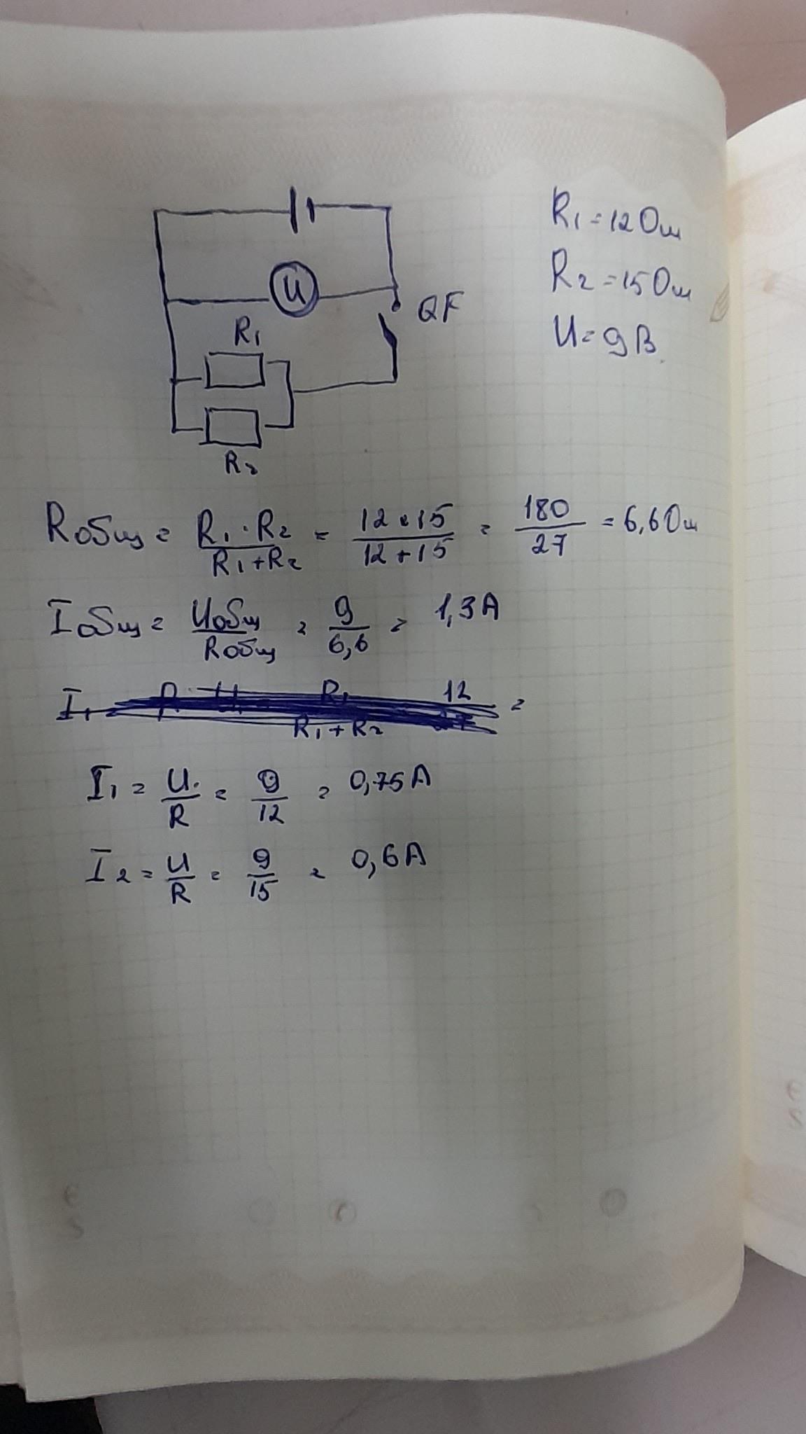 определить значение силы тока в резисторах если известны:сопротивление-r1-12 ом сопротивление:r2-15 ом напряжение:u-9 в