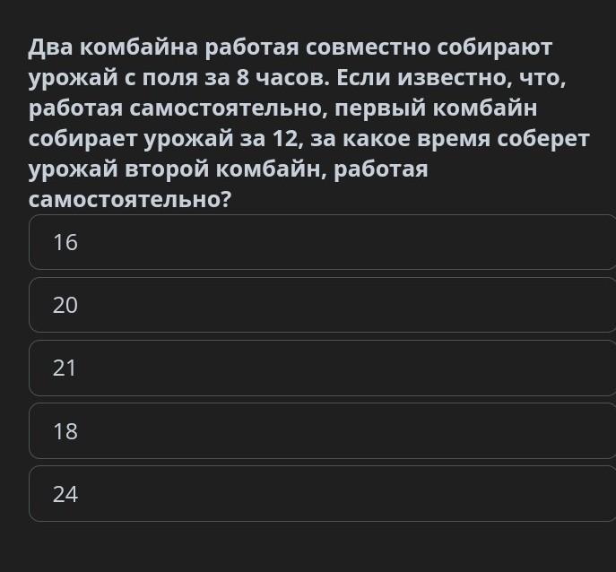 Ответ: 24 ч понадобится второму, чтобы собрать урожай.
