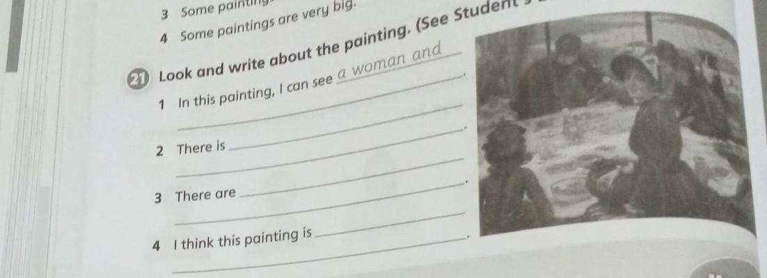21 Look and write about the painting. (See Student's Book page 72.) 1 In this painting, I can see a woman and 2 There is 3 There are 4 I think this painting is