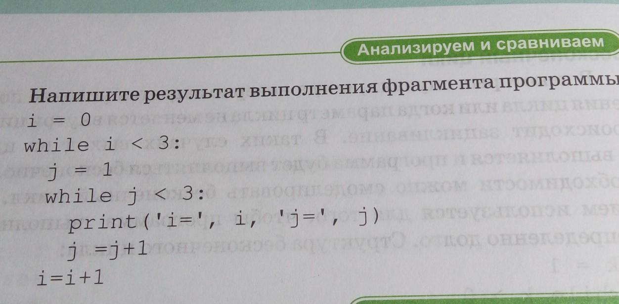 Анализируем и сравниваем 3 — Напишите результат выполнения фрагмента програрга i = 0 while i < 3: ј=1 while j < 3: print (i=', i, j=", ј) j =j+1 i=i+1