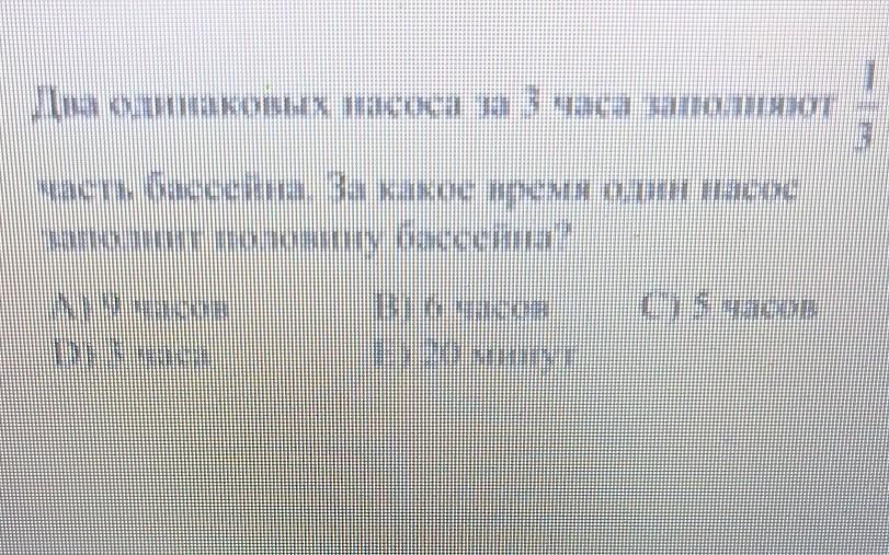 три на три равняется девять а один на один равняется 1 и в итоге получится у нас 9/1 а 9/1 это тоже самое что и 9, итог: за 9 часов один насос наполнит половину бассейна