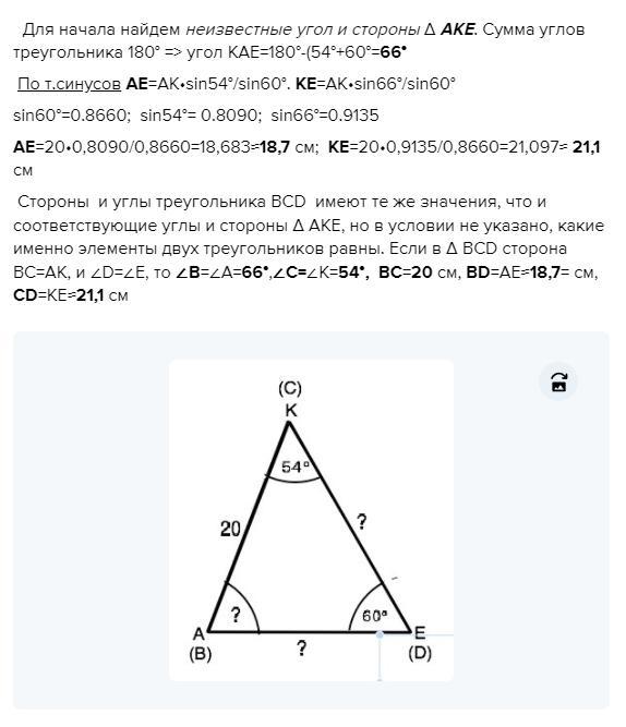 1)Треугольники BCD и AKE равны. Известно, что АК - 20 см, = 54°, LE - 60°. Найдите соответствующие углы и сторону треугольника BCD.
