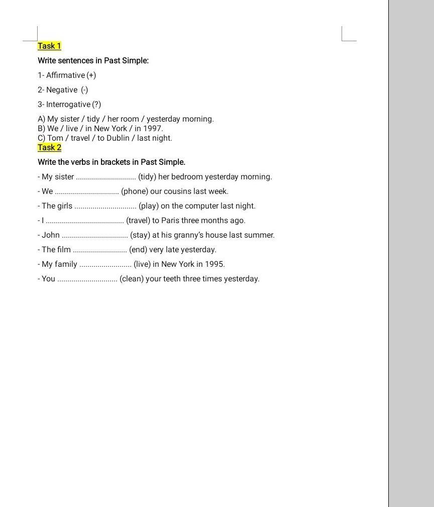 Task 1 Write sentences in Past Simple: (напишите три типа предложения в паст симпл: плюсовое, отрицательное и вопросительное) 1- Affirmative (+) 2- Negative (-) 3- Interrogative (?) A) My sister / tidy / her room / yesterday morning. B) We / live / in New York / in 1997. C) Tom / travel / to Dublin / last night. Task 2 Write the verbs in brackets in Past Simple. (напишите глаголы в скобках в паст симпл) - My sister .............................. (tidy) her bedroom yesterday morning. - We ................................ (phone) our cousins last week. - The girls ............................... (play) on the computer last night. - I ....................................... (travel) to Paris three months ago. - John ................................. (stay) at his granny’s house last summer. - The film ........................... (end) very late yesterday. - My family .......................... (live) in New York in 1995. - You .............................. (clean) your teeth three times yesterday.