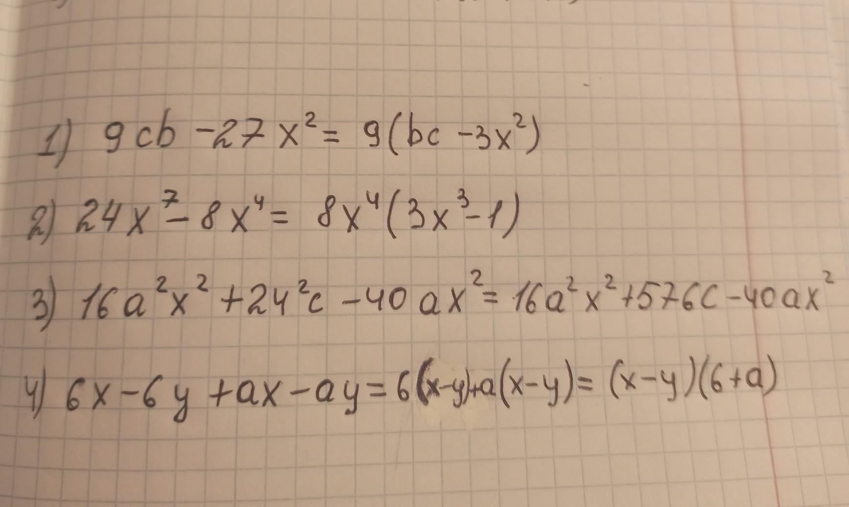 Розкладіть многочлен на множники: 1) 9cb - 27x2; 2) 24x7-8x; 3) 16a²x² +24a³c - 40ax²; 4) 6x-6y + ax - ay.