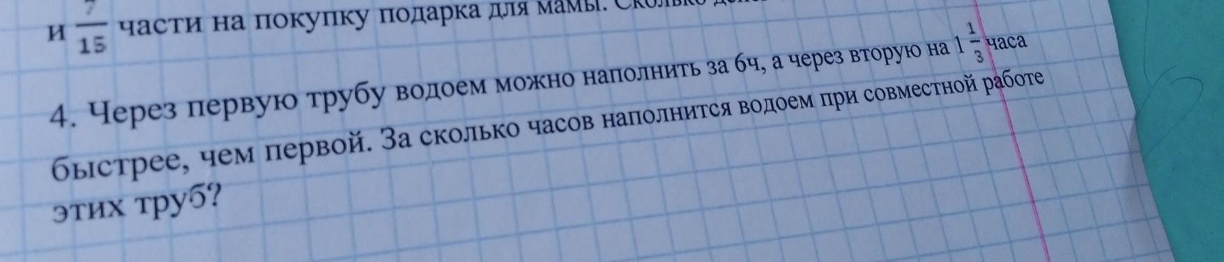 По условию, через первую трубу водоем можно наполнить за 6 часов, а через вторую на 1 1/3 часа быстрее, чем первой.