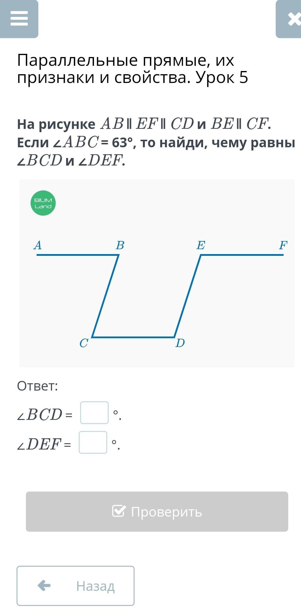 На рисунке AB|| EF|| CD и BEl CF. Если zАВС=63°, то найди, чему равны <BCD и DEF.