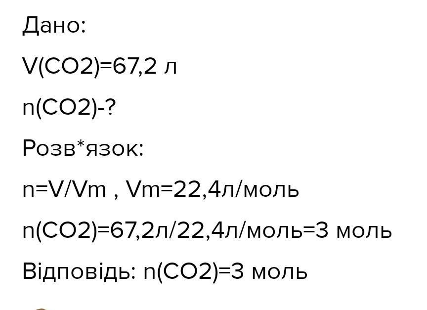 1. Яка кількість речовини карбон(ІV) оксиду CO, об'ємом 67,2 л?