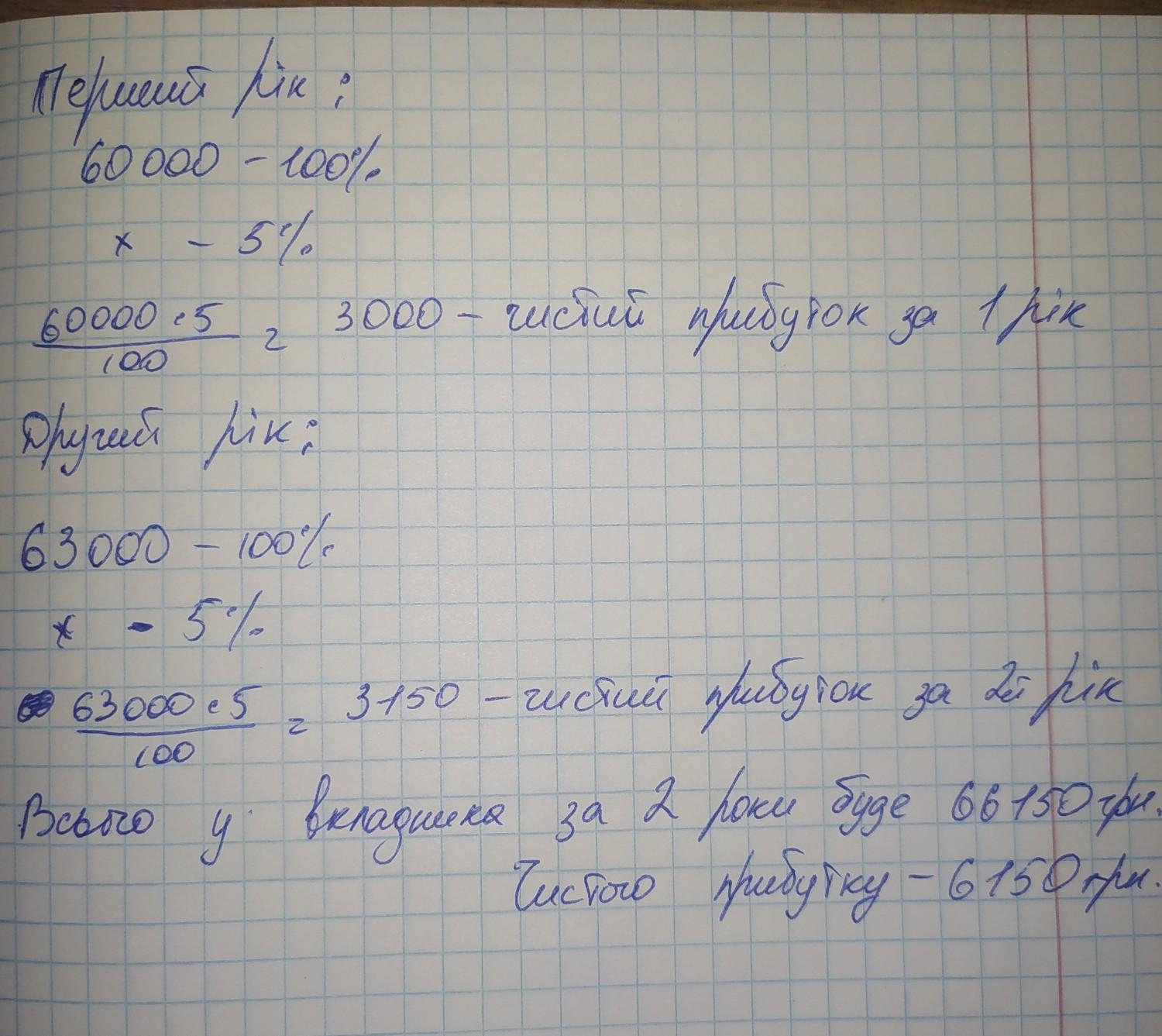 6. Микола Петрович поклав у банк 60 000 грн на два роки. Щороку банк нараховує 5% річних. Скільки грошей отримає вкладник через два роки?
