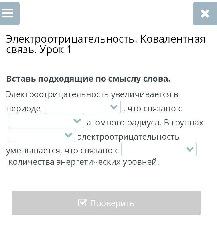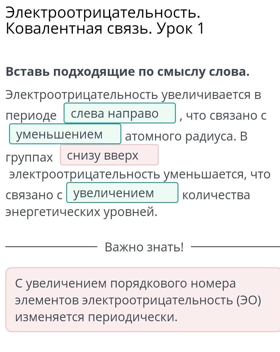 Вставь подходящие по смыслу слова. Электроотрицательность увеличивается в периоде , что связано с атомного радиуса. В группах электроотрицательность уменьшается, что связано с количества энергетических уровней.