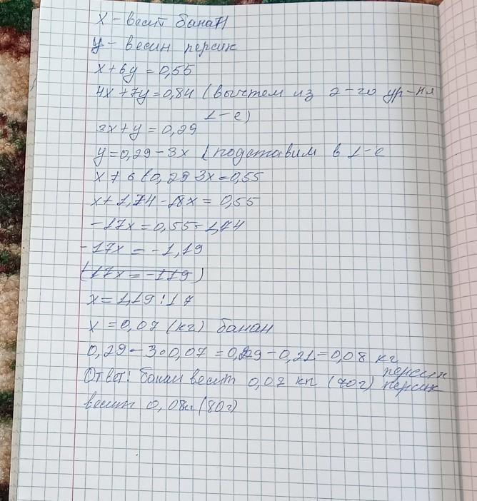 б) Маса одного банана й 6 персиків разом 0.55 кг, а 4 бананів та 7 персиків — 0,84 кг. Яка маса одного банана й одного персика окремис? -