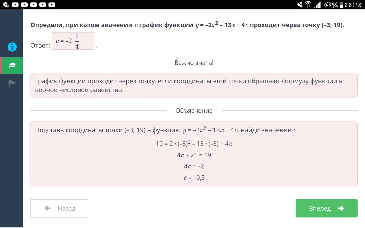 Определи, при каком значении c график функции y = –2x² – 13x + 4c проходит через точку (–3; 19).
