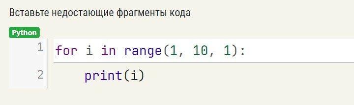 Изменяя значение переменной цикла со значения равного 1 до значения равного 10, с шагом +1, в теле цикла выводится значение переменной i на экран.
