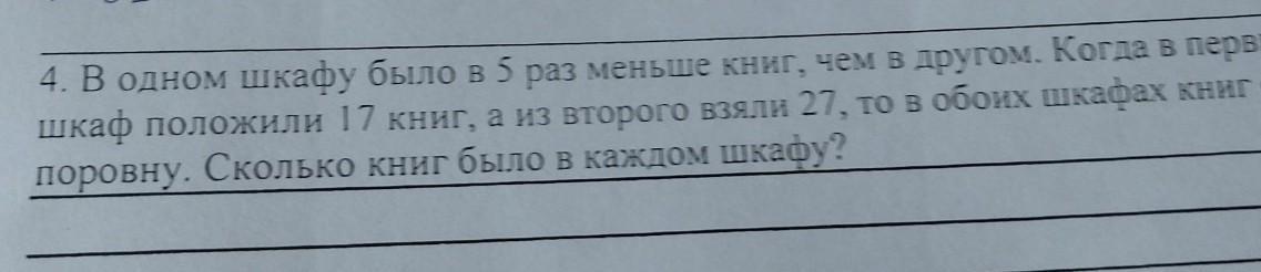 4. В одном шкафу было в 5 раз меньше книг, чем в другом. Когда в первый шкаф положили 17 книг, а из второго взяли 27, то в обоих шкафах книг стало поровну. Сколько книг было в каждом шкафу? ПОМОГИТЕ ПОЖАЛУЙСТА СРОЧНО
