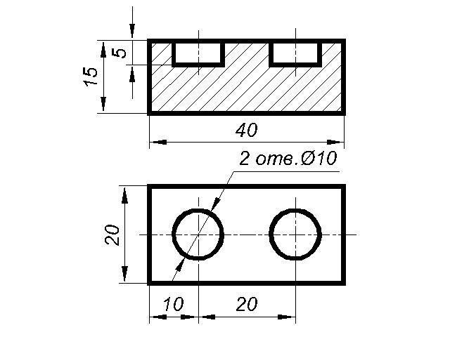 Если Вы изучали тему "разрезы", то вид спереди (главный вид) нужно заменить фронтальным разрезом (см. второй чертеж в приложении), т.к. размеры не указывают по невидимым (штриховым) линиям.