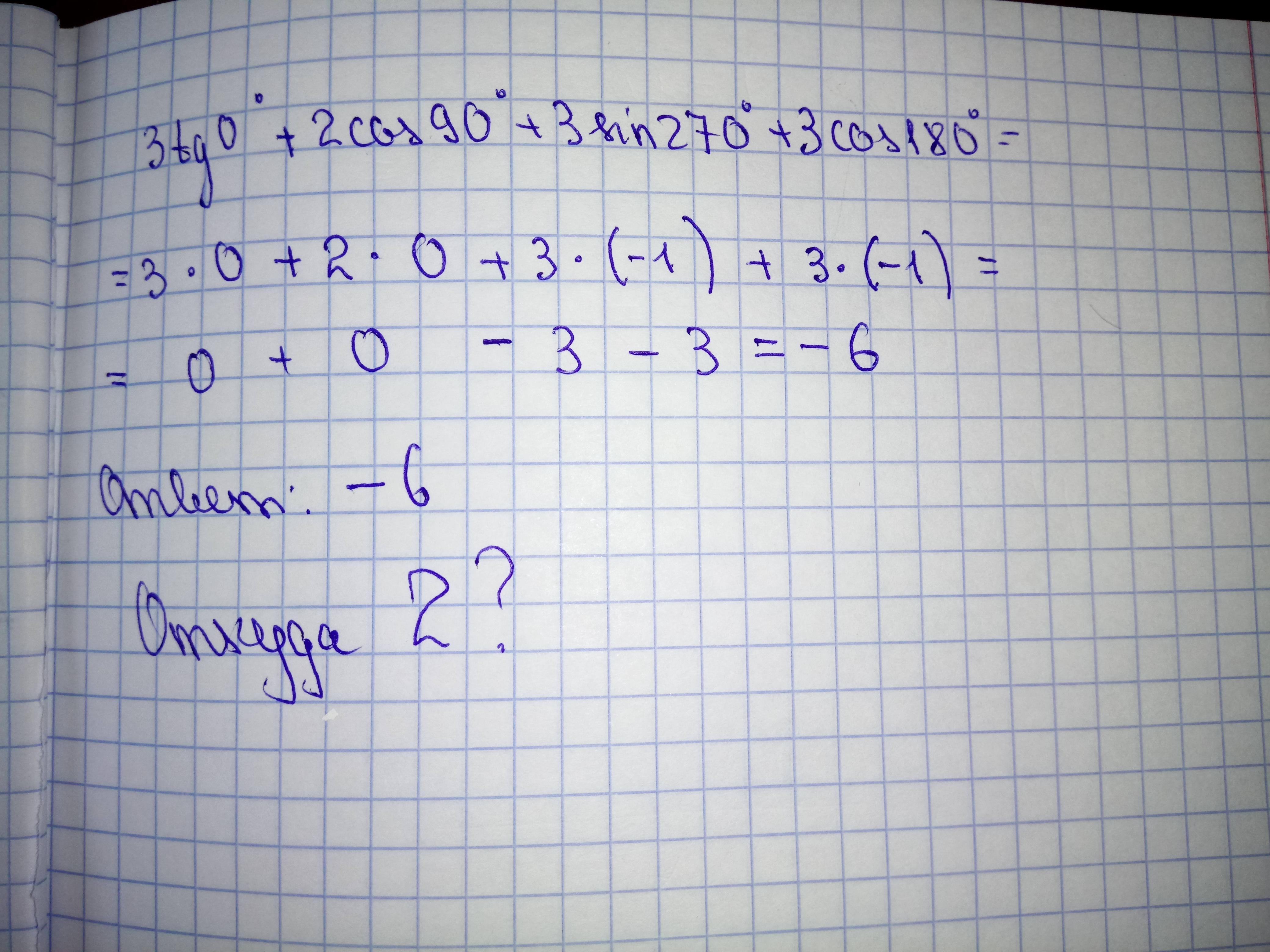 3tg0+2 cos90 + 3sin 270+3cos180 ответ=2
