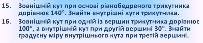 15.Наружный угол при основании равнобедренного треугольника равен 140 градусам. Найдите внутренние углы треугольника.