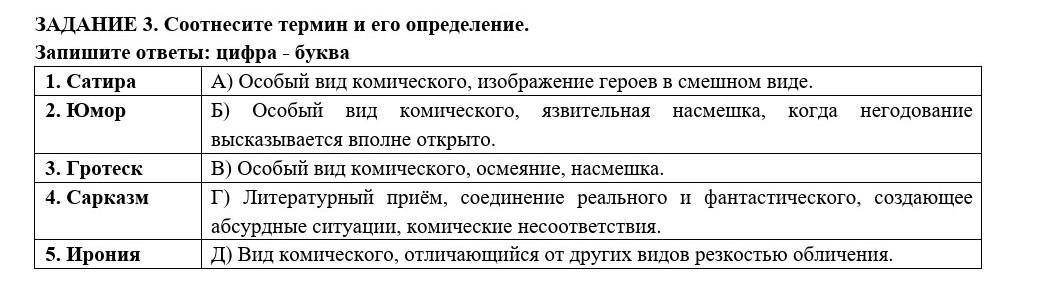 4. Сарказм Г) Литературный приём, соединение реального и фантастического, создающее абсурдные ситуации, комические несоответствия.
