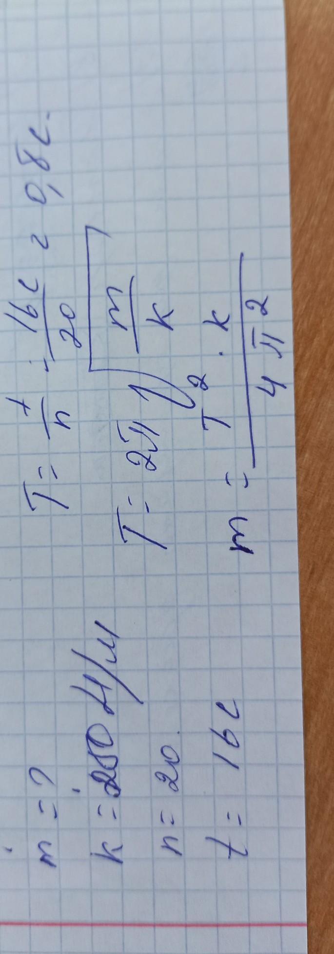 1. Определите массу груза, который на пружине с жесткостью 250 Н/м делает 20 колебаний за 16 с. можно в письменном виде в тетради пожалуйста