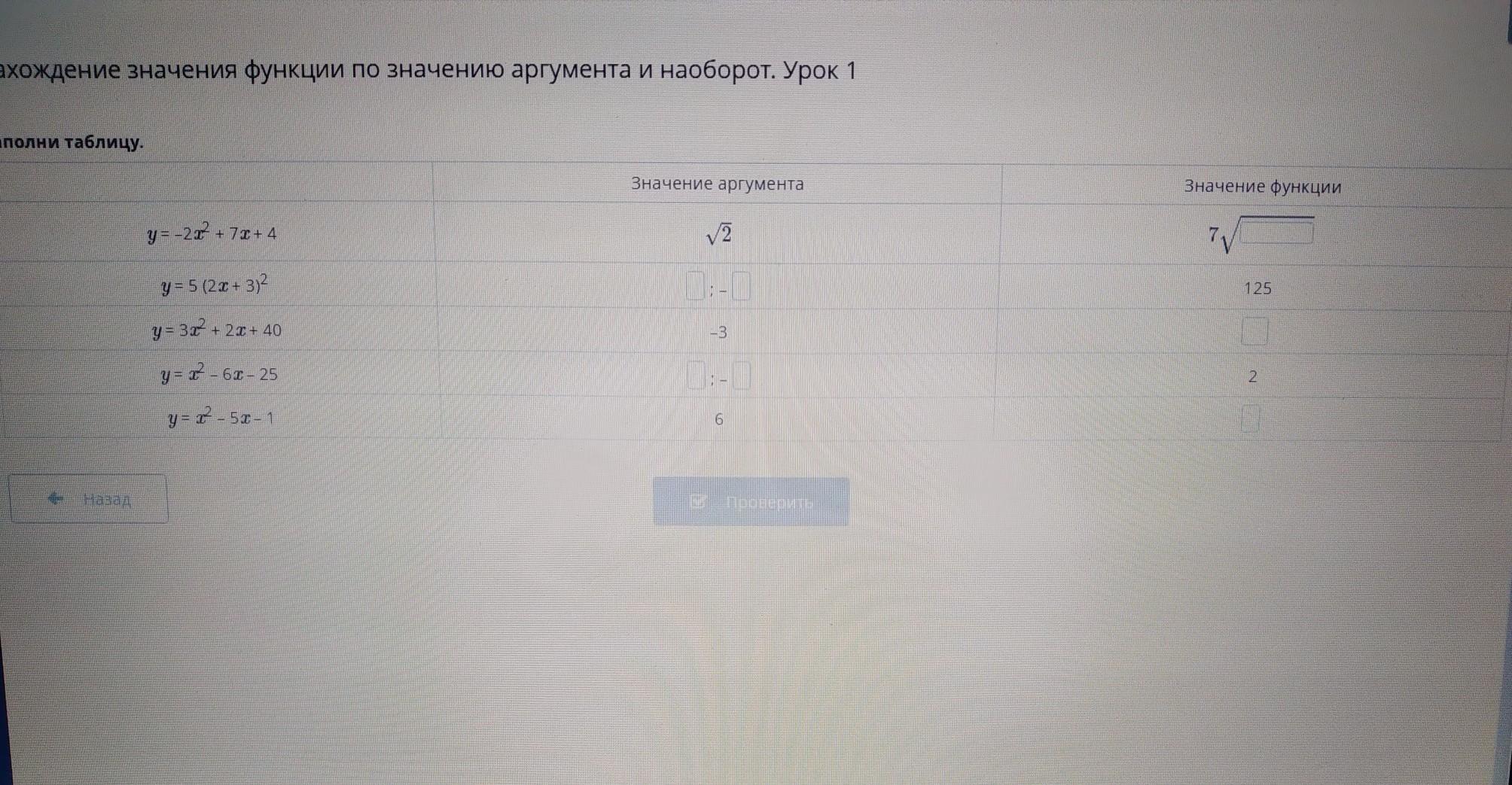 Нахождение значения функции по значению аргумента и наоборот. Урок 1 Заполни таблицу. Значение аргумента у = -2 + 71 + 4 2 y = 5 (22+ 3)2 у = 3 + 2 + 40 -3 y = ? - 61 – 25 T - 5T - 1 6 5