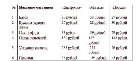 Мама отправила в 10 часов утра Мишу и бабушку Раю за покупками в магазин. Это был день недели - среда. Мама знала, что в среду в некоторых магазинах действуют скидки. Она дала им с собой 400 руб. и список необходимых покупок: батон, буханку черного хлеба, пакет кефира, пачку пельменей, упаковку сосисок, пряники. Поблизости находились магазины, со следующими ценами на интересующий товар. Как вы думаете, в каком магазине Миша и бабушка Рая сделают выгодную покупку?