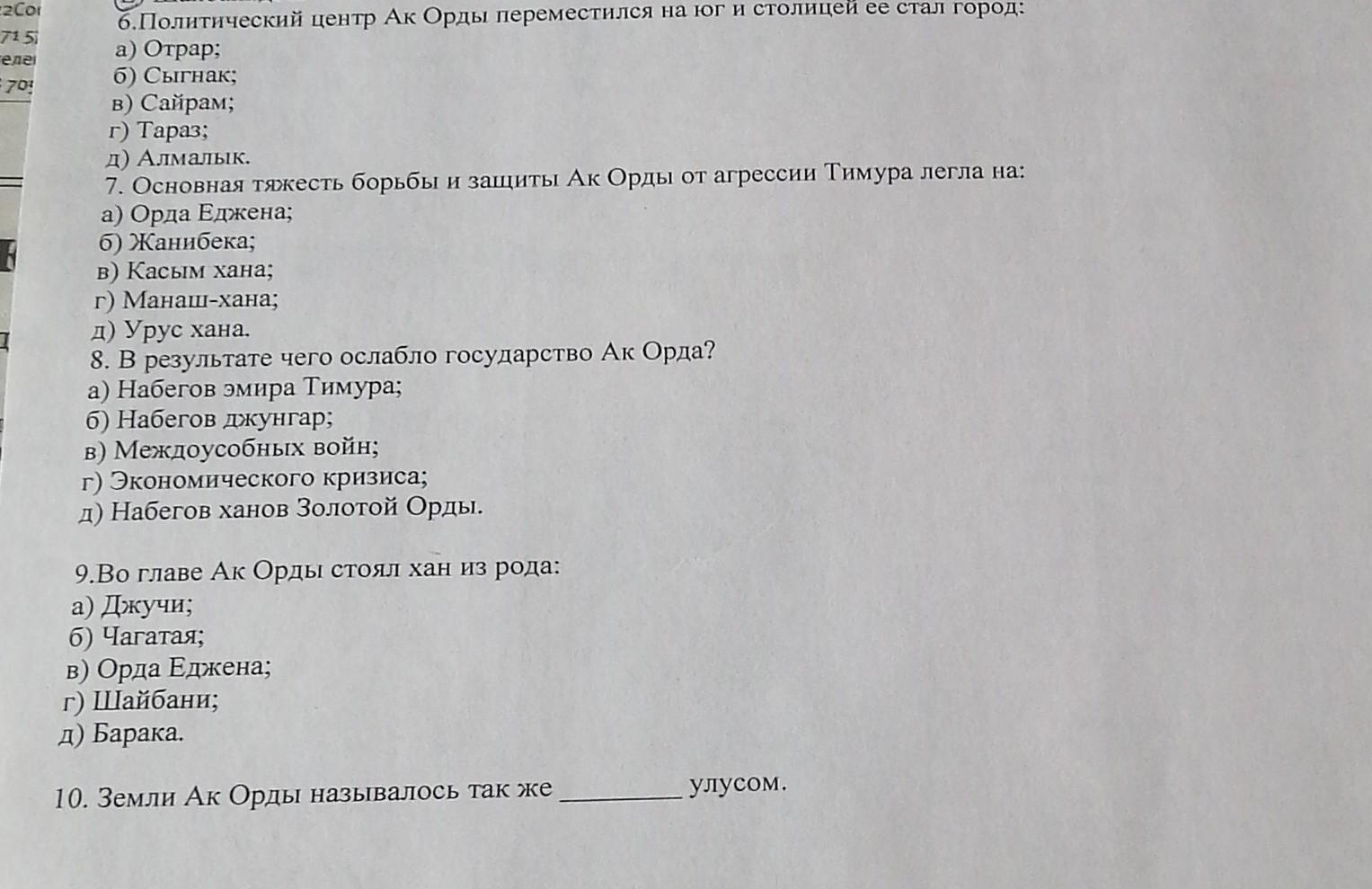 0 тен 000 E oo g manners на про як і я, 1. На территории Восточного Дешт-и Кыпчака государство Ак Орда существовало в период arm a a А) в XII- начале XV вв. -35 000 B) B XI - XI CB XIV - XVII D) в XV- в начале XVII E) в X - в середине XII 2. В Ак Орде бурно развивается городская культура, строятся мечети, медресе, торговые центры в перио, правления хана оу и A) Барака В) Тохтамыша C) Урус эту D) Жанибек E) Ерзена. 3. Ак Орда значительно укрепилась при правившем в 60-70 гг. XIV в. у A) Барака В) Тохтамыша C) Урус D) Жанибек E) Ерзена. 4. Последний хан Ак Орды A) Барак В) Тохтамыш C) Урус D) Жанибек E) Ерзен 5 Р1400 р остоином Пешт-и-Кыпчаке власть взял Абулхаир, представитель династии