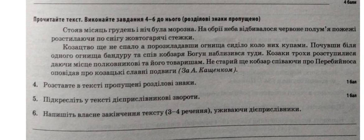 Стояв місяць грудень, і ніч була морозна.На обрії неба відбивалося червоне полум’я пожежі, розстилаючи по снігу жовтогарячі стежки.Козацтво ще не спало, а, порозкладавши огнища, сиділо коло них купами.Почувши біля одного огнища бандуру та спів кобзаря.Козаки трохи розступилися даючи місце полковникові й його товаришам.Не старий ,ще кобзар співав про Перебийноса,оповідав про козацькі славні подвиги.