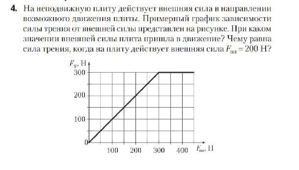 •На неподнвижную плиту действует внешняя сила в нашравлении возможного движения плиты. Примерный график зависимости силы трения от внешней силы представлен на рисунке. При каком значении внешпей силы плита пришла в движение? Чему равна сила трения, когда на плиту действует внешняя сила Fвн=200 H?