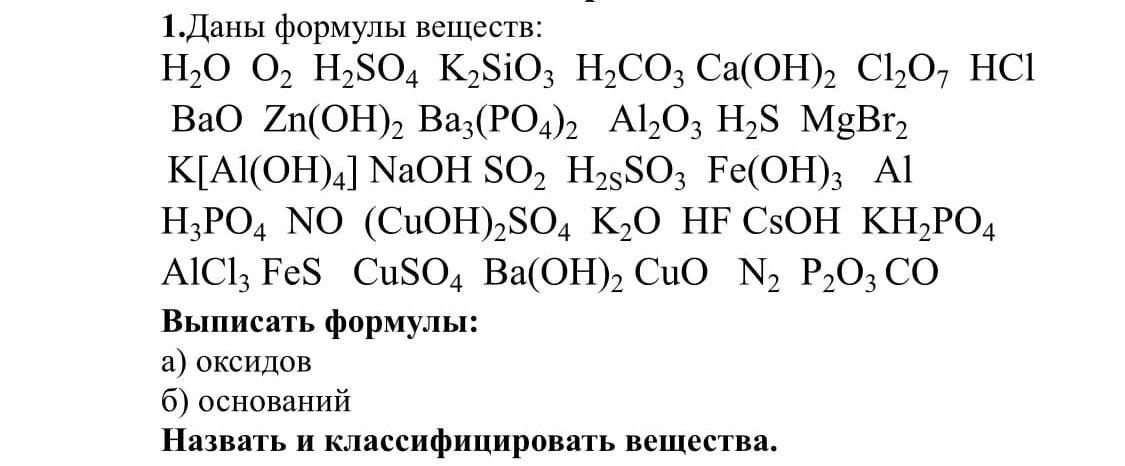 Ответ: а) H2O(Оксид водорода), Cl2O7(Оксид хлора VII), BaO (Оксид бария), Al203(Оксид алюминия), SO2 (Оксид серы IV), NO (Оксид азота II) K20(Оксид калия), CuO(Оксид меди), CO (Оксид углерода II).