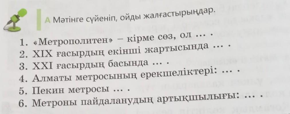 А Мәтінге сүйеніп, ойды жалғастырыңдар. 1. «Метрополитен » — кірме сөз, ол .. 2. ХІХ ғасырдың екінші жартысында 3. ХХІ ғасырдың басында 4. Алматы метросының ерекшеліктері: 5. Пекин метросы .. 6. Метроны пайдаланудың артықшылығы: