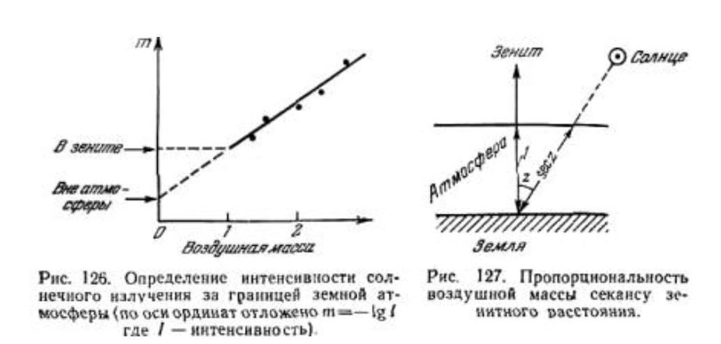 Измерение солнечной постоянной — очень сложная задача, требующая проведения целой серии тщательных наблюдений с приборами двух различных типов. Приборы первого типа называются пиргелиометрами. Их задача — измерить в абсолютных энергетических единицах полное количество солнечной энергии, падающей за определенное время на площадку известной величины. Однако показание пиргелиометра не дает еще непосредственного значения солнечной постоянной из-за того, что часть излучения Солнца поглощается при прохождении сквозь земную атмосферу. Чтобы учесть это поглощение, одновременно с измерениями на пиргелиометре проводят серию измерений распределения энергии в спектре Солнца на другом приборе — спектроболометре, обладающем одинаковой чувствительностью к лучам различных длин волн. Эти измерения проводятся для нескольких значений зенитных расстояний Солнца, когда его лучи проходят сквозь различную толщину слоя воздуха. Для каждой длины волны можно построить в виде графика зависимость интенсивности солнечного излучения от воздушной массы (рис. 126). Воздушной массой называется отношение оптической толщины слоя воздуха в данном направлении и в направлении на зенит. Из геометрических соображений (рис. 127) видно, что для плоскопараллельных слоев атмосферы воздушная масса пропорциональна секансу зенитного расстояния (sec z).