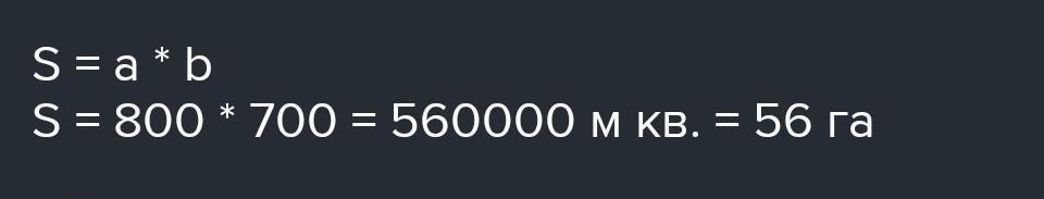 Обчисли площу земельної ділянки прямокутної форми, довжина якої 800 м, а ширина 700 м .Запиши відповідь у гектарах