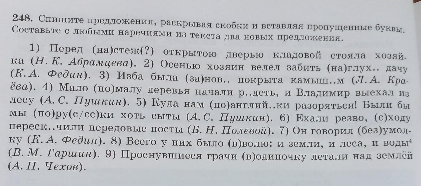 248. Спишите предложения, раскрывая скобки и вставляя пропущенные буквы. Составьте с любыми наречиями из текста два новых предложения. 1) Перед (на)стеж(?) открытою дверью кладовой хозяй- ка (Н. К. Абрамцева). 2) Осенью хозяин велел забить (на)глух.. дачу (К. А. Федин). 3) Изба была (за)нов.. покрыта камыш..м (Л. А. Кра- ёва). 4) Мало (помалу деревья начали р..деть, и Владимир выехал из лесу (А. С. Пушкин). 5) Куда нам (по) англий..ки разоряться! Были бы мы (по)ру(с/сс)ки хоть сыты (А. С. Пушкин). 6) Ехали резво, (c)ходу переск..чили передовые посты (Б. Н. Полевой). 7) Он говорил (без) умол- ку (К. А. Федин). 8) Всего у них было (в)волю: и земли, и леса, и воды (В. М. Гаршин). 9) Проснувшиеся грачи (в) одиночку летали над землёй (А. П. Чехов).