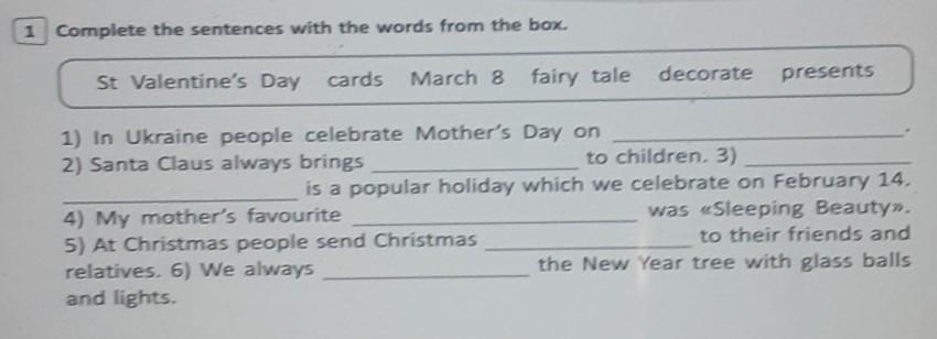 1 Complete the sentences with the words from the box. St Valentine's Day cards March 8 fairy tale decorate presents 1) in Ukraine people celebrate Mother's Day on 2) Santa Claus always brings to children. 3) is a popular holiday which we celebrate on February 14. 4) My mother's favourite was «Sleeping Beauty 5) At Christmas people send Christmas to their friends and relatives. 6) We always the New Year tree with glass balls and lights