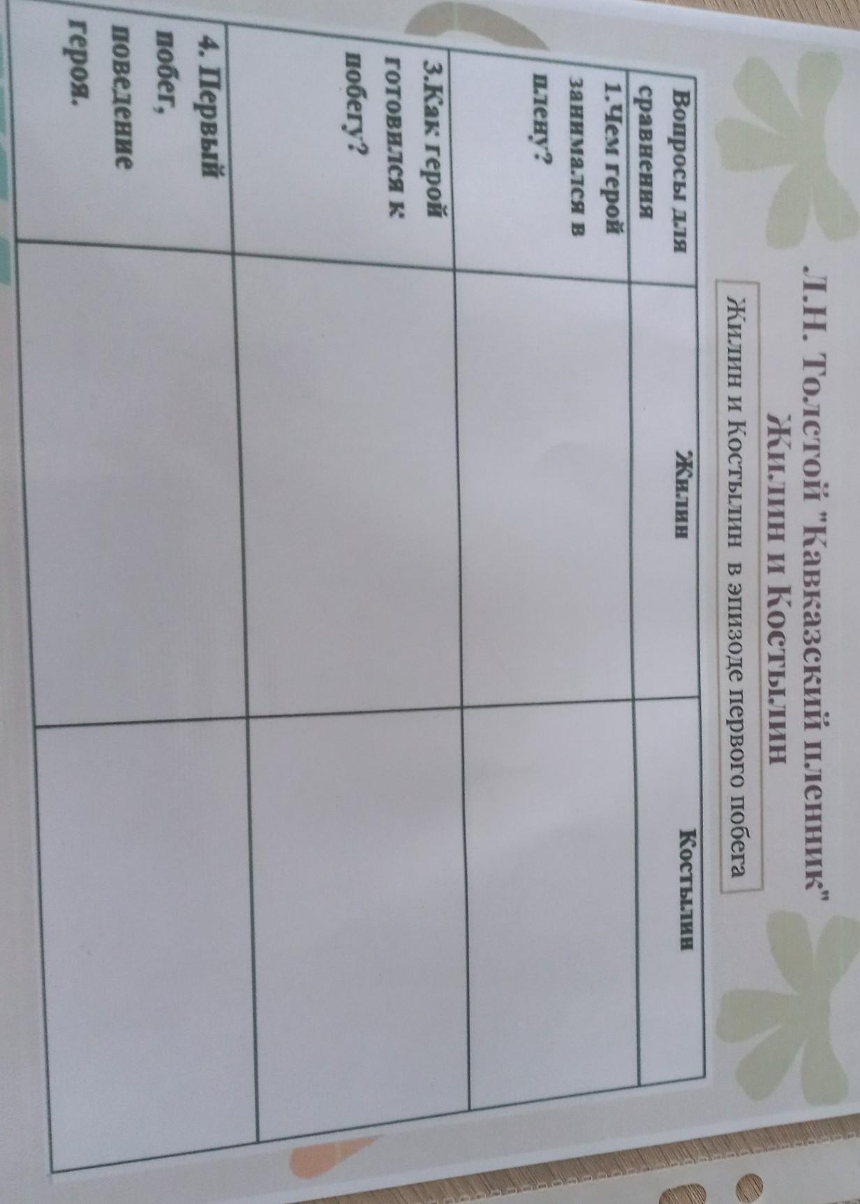1.Костылин все ждал из дома денег на выкуп и умирал от скуки. Жилин трудился - делал из глины игрушки, а из прутиков плел плетенки. Вел он себя активно для того, чтобы иметь возможность ходить по аулу и за его пределы. Он изучал местность и искал способ бежать из плена. Жилин даже сумел починить часы своего хозяина и вылечить заболевшего татарина. Так он создал себе репутацию народного умельца. Доказал, что и в плену человек остается человеком.