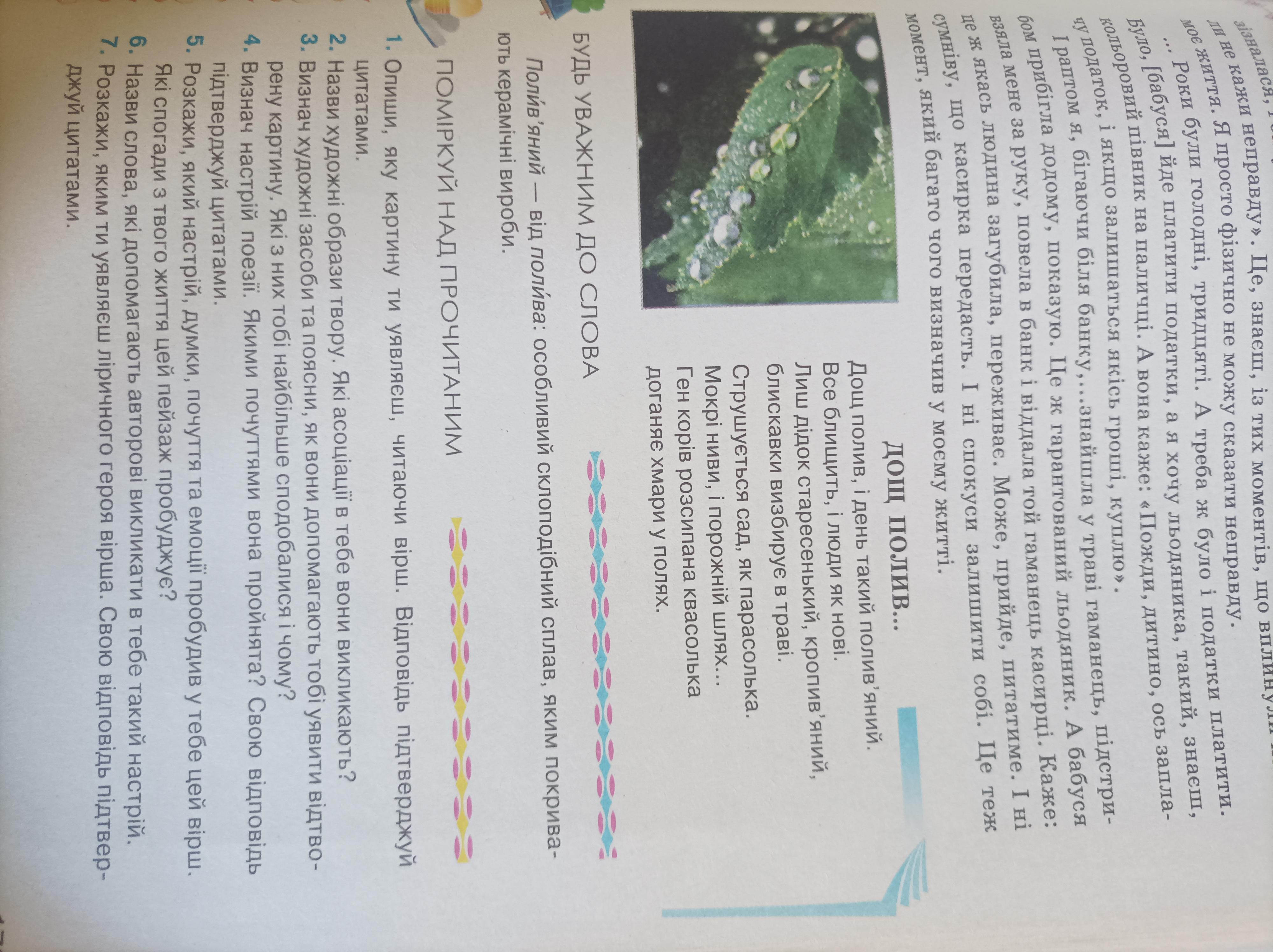 Дайте відповідь на запитання 1,5,7, прочитавши поезію "Дощ полив..."
