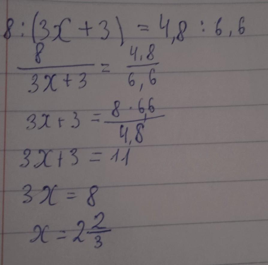 8:(3х+3)=4,8:6,6= 5/24*52,8= 3х+3= 5/24*264/5= 3х+3= 1/24*264= 3х+3= 11=3х+3= 11-3х=3= -3х+3=-11= -3х=-8=х=8/3=2 целих 2/3