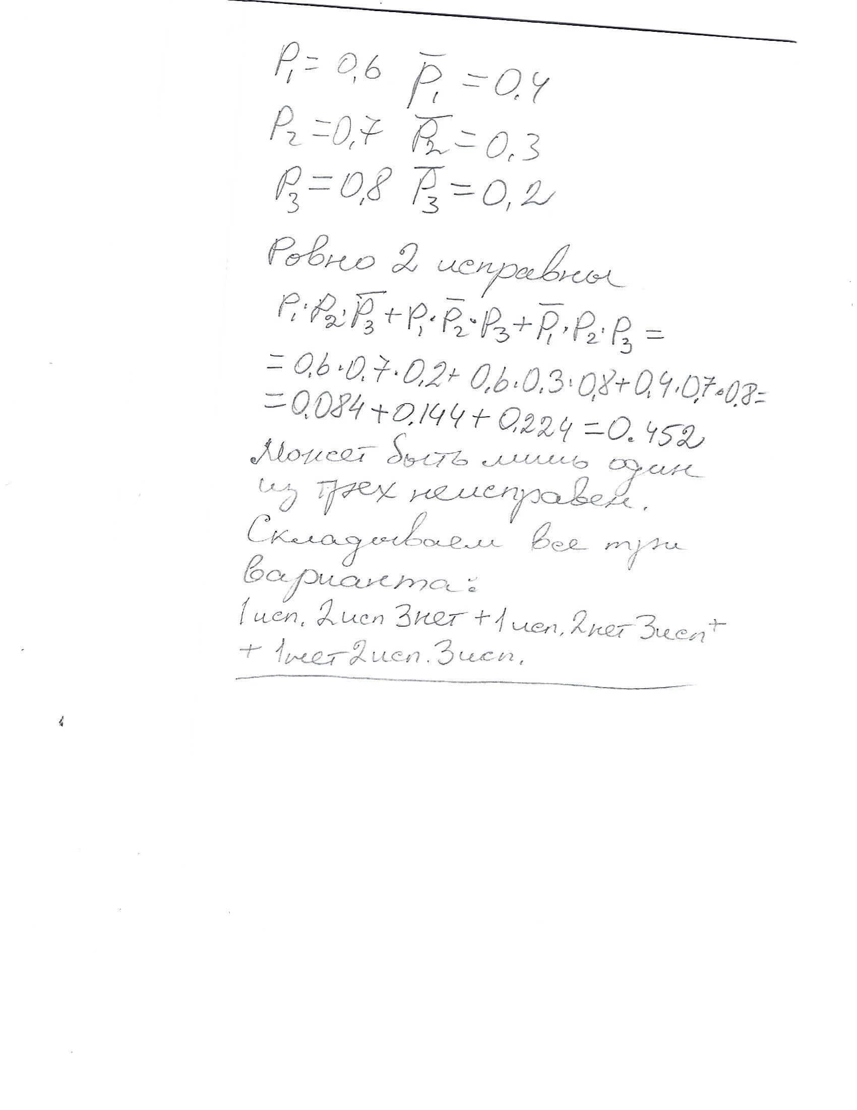 Рабочий обслуживает 3 станка. Вероятность того, что в течении смены станки будут исправны равна: для первого станка 0.6; для второго станка 0.7; для третьего 0.8. Найти вероятность того, что только два станка в течении смены будут исправны.