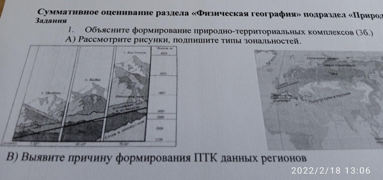 Задания 1. Объясните формирование природно-территориальных комплексов (36 A) Рассмотрите рисунки, подпишите типы зональностей. Boas м. Хар Херде Актическое рукін Індон лесная хад Sky Акуска, не са 1. АRetta tlar xat Коха anynycТодни и тустай ламалайхис анг 30 Сток и сахиулах 15:33 ) Выявите причину формирования ПТК данных регионов Tre