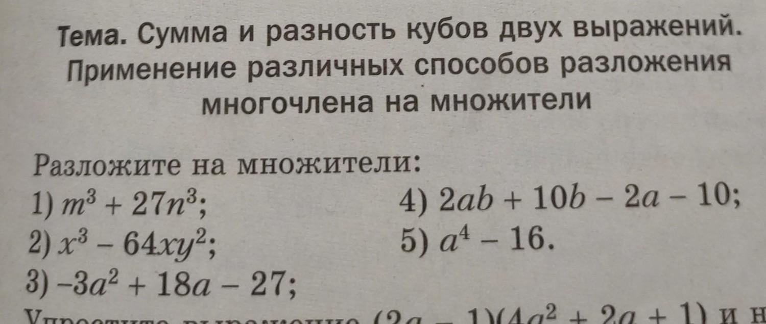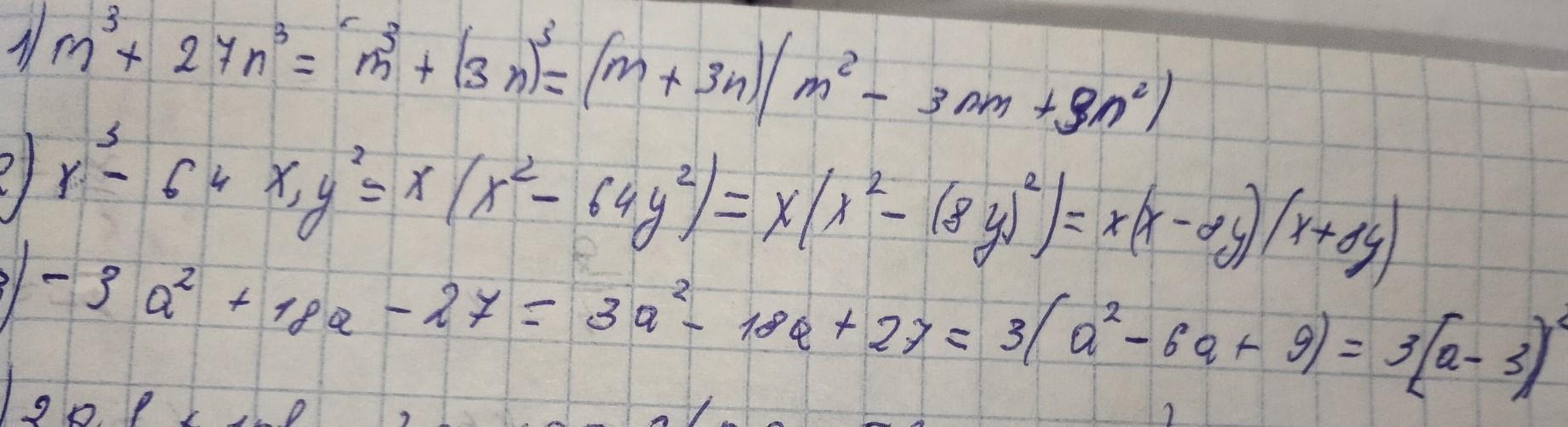 1)m3+27n3=(m+3n)(m2-3mn+9n2). 2)х3-64ху2=х(х2-64у2)=х(х-8у)(х+8у). 3)-3а2+18а-27=-3(а2-6а+9)=-3(а-3)2. 4)2аb+10b-2a-10=2b(a+5)-2(a+5)=2(a+5) (b-1). 5)a4-16=(a2-16)(a2+16)=(a-4)(a+4)(a2+16)