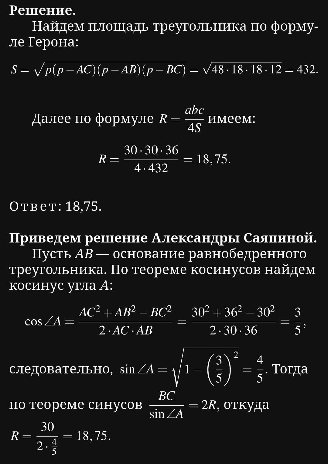 Боковые стороны равнобедренного треугольника равны 30, а его основание равно 36. Найдите радиус окружности, описанной около треугольника.