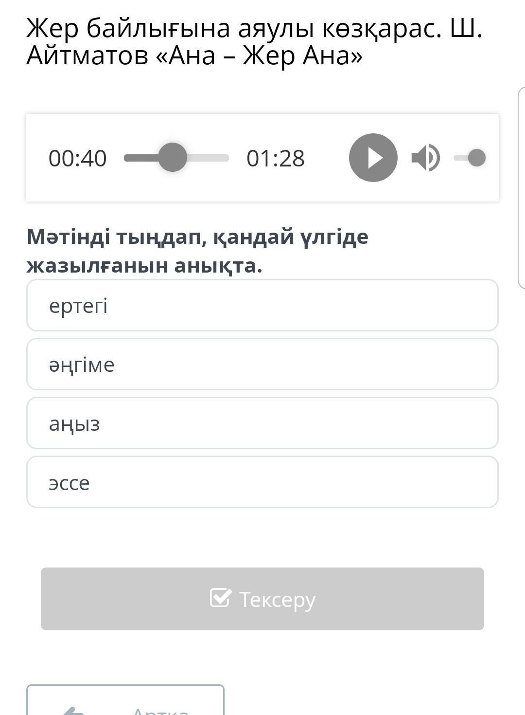 Жер байлығына аяулы көзқарас. Ш. Айтматов «Ана – Жер Ана» 00:40 01:28 Мәтінді тыңдап, қандай үлгіде жазылғанын анықта. ертегі əңгіме аңыз эссе Артқа Тексеру