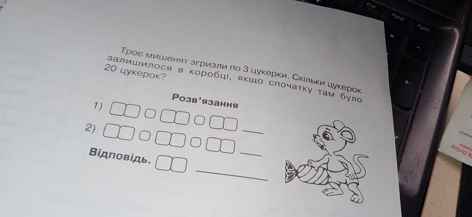 раз мышонка было 3, а каждый съел по 3 конфеты, то всего было съедено 3*3=9 конфет. раз изначально было 20 конфет, то осталось 20-9=11 конфеи