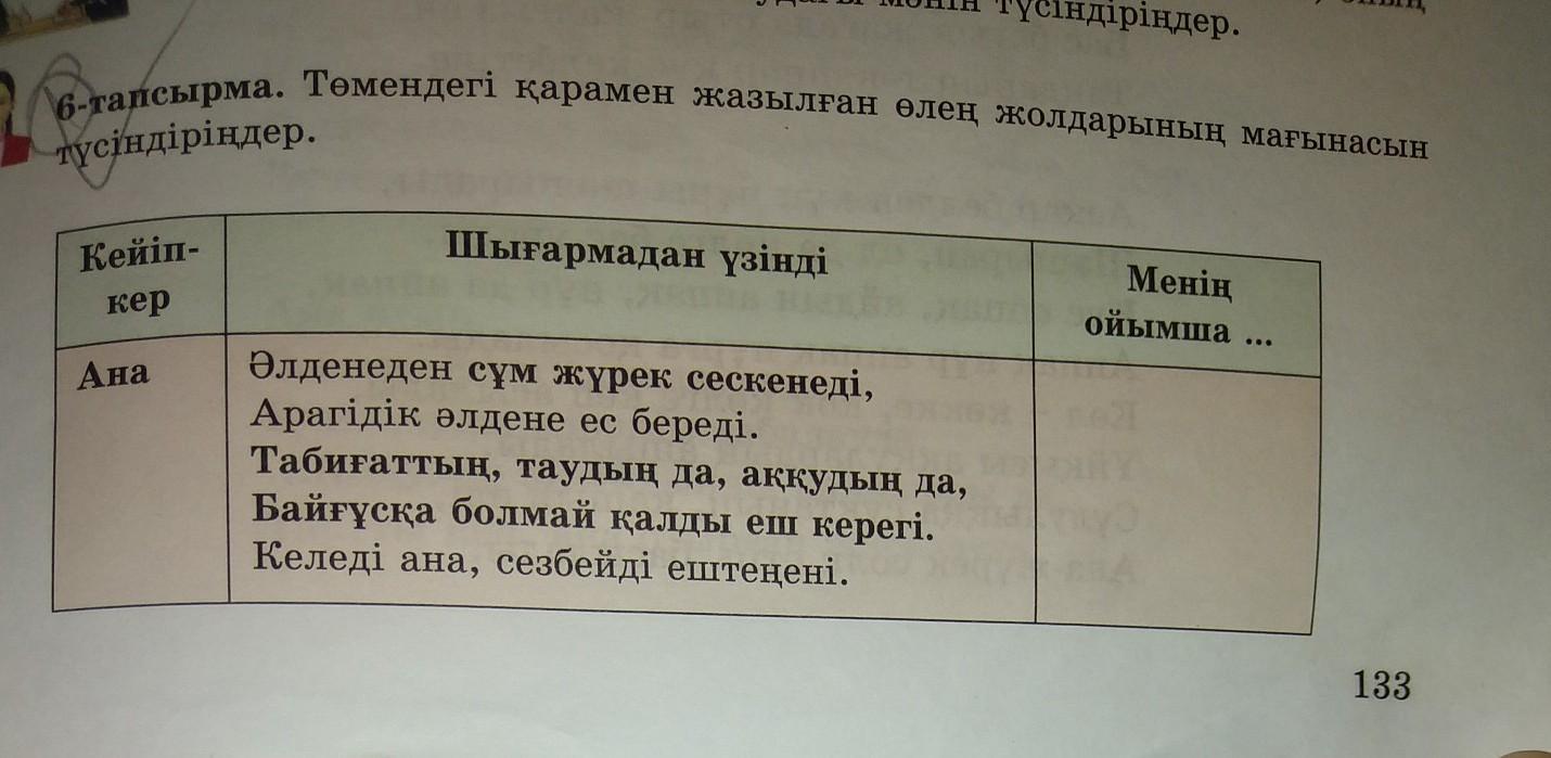 6-тапсырма. Төмендегі қарамен жазылған өлең жолдарының мағынасын түсіндіріңдер. Кейіп- Шығармадан үзінді Менің ойымша ... кер Ана Әлденеден сұм жүрек сескенеді, Арагідік әлдене ес береді. Табиғаттың, таудың да, аққудың да, Байғұсқа болмай қалды еш керегі. Келеді ана, сезбейді ештеңені.133бет