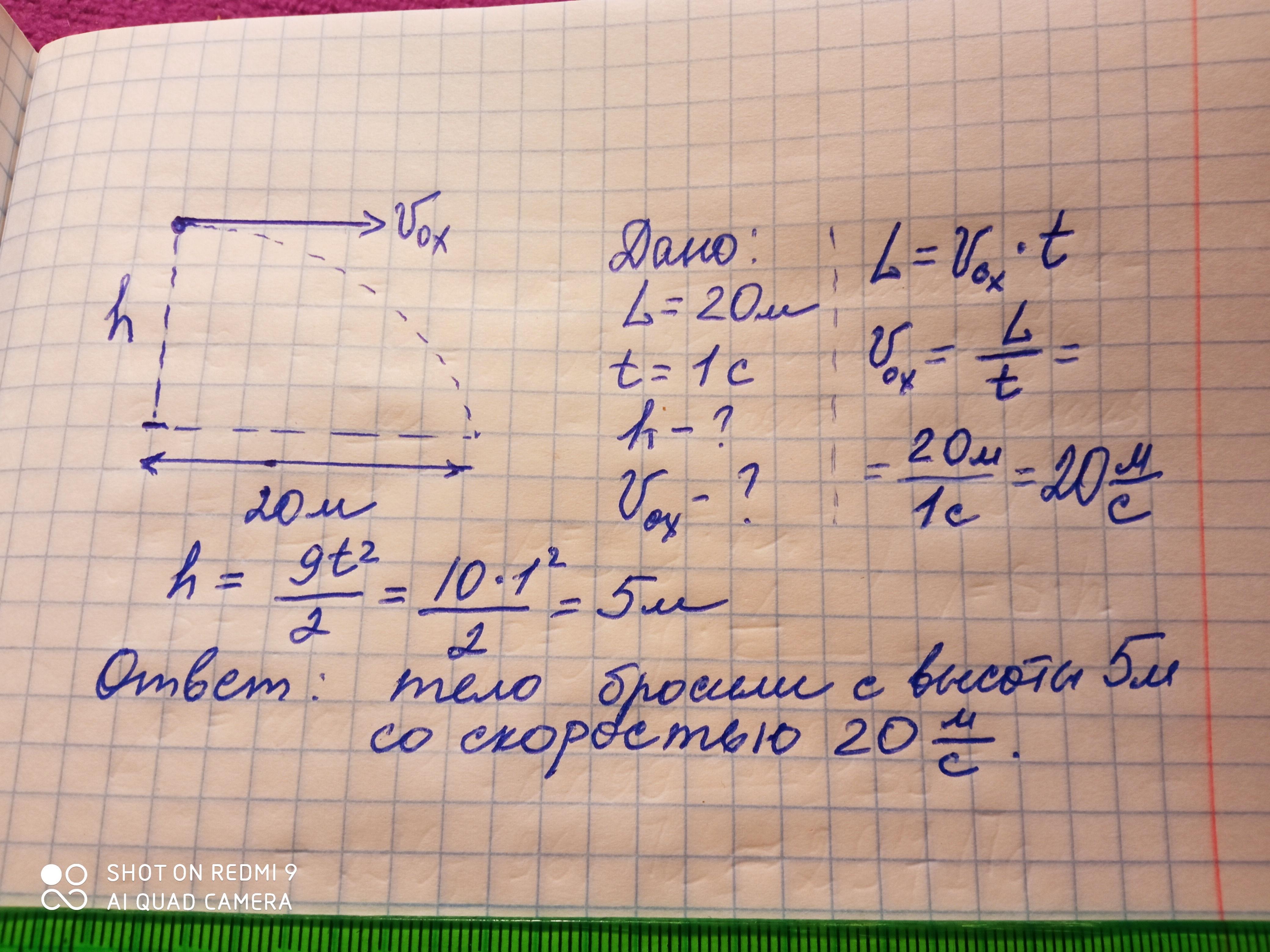 Учень кинув м'яч горизонтально з вікна будинку. М'яч упав на відстані 20 м через 1 с. З якої висоти кинуто м'яч? З якою швидкістю?