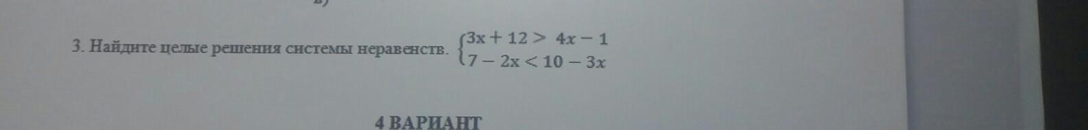 3. Найдите целые решения системы неравенств. 3x + 12 > 4x - 1, \7 - 2x < 10 - 3x