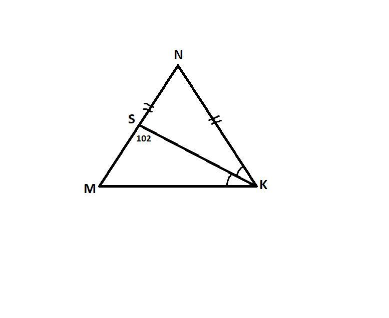 Найди углы равнобедренного треугольника MNK с основанием MK, если kc биссектриса этого треугольника, точка S принадлежит MN, угол MSK=102°. Найдите сколько равен угол M, N, K. Срочно, даю 30 баллов