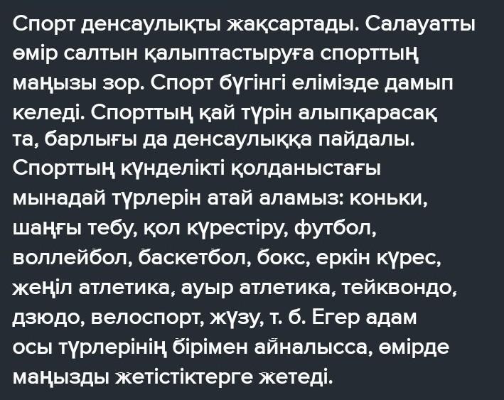 «Спорт – денсаулық кепілі» тақырыбында себептерін айқын көрсете отырып, келісу-келіспеу эссесін жазыңыз. (Эссе жазу барысында есімдіктерді , етіс жұрнақтарын қатыстырып жазыңыз)