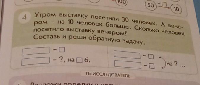 4. Утром выставку посетили 30 человек. А вече- на 10 человек больше. Сколько человек посетило выставку вечером? Составь и реши обратную задачу. ром